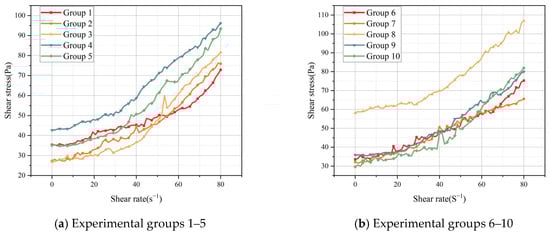 The rheological experiments on the tailing sand slurry, which employed a rheological apparatus, yielded the following results, as illustrated in Figure 10. The observed fluid behavior aligns more closely with the Bingham-type flow characteristics. The Bingham-type flow is distinguished by the presence of yield stress, which denotes that the fluid begins to flow only when the applied stress surpasses a critical threshold (yield stress). Consequently, under conditions of low stress, the fluid manifests the properties of a solid and is incapable of flow, only beginning to deform when sufficient external force is applied.