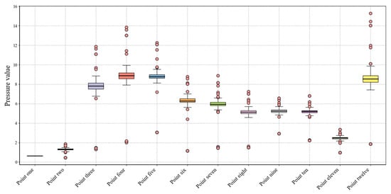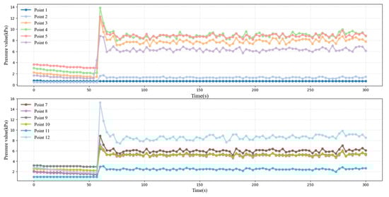 In the tailing sand filling slurry pipeline transport test, the measurement time for each set of experiments was 300 s. To minimize the influence of random errors on the experimental results, each set of experiments was repeated three times. During each experiment, data from 12 pressure sensors were collected in real time to monitor pressure changes at various locations in the pipeline, as shown in Figure 11. This data provides a sufficient basis for a comprehensive understanding of the pressure distribution characteristics of the slurry inside the pipe, which can reflect the detailed changes in the slurry flow process. In addition, the data collected provides important support for subsequent rheological analysis and model validation.