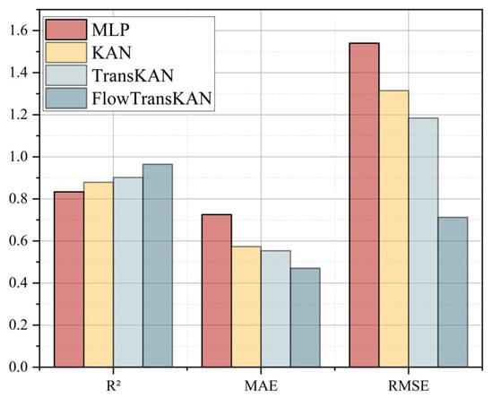 In the following ablation experiments, the effectiveness of the models was verified by analyzing the performance differences between KAN, TransKAN, and FlowTransKAN and using the neural network MLP as a reference benchmark. As illustrated in Figure 13, the KAN model demonstrates superior performance in terms of R2, MAE, and RMSE metrics when compared to the MLP model. An analysis of the underlying logic of the MLP and the KAN models reveals that the MLP’s deficiency stems from its reliance on a substantial number of neurons to compensate for the constrained expressive capacity of the fixed activation function. In contrast, the KAN model replaces the fixed activation function with a learnable spline function, thereby enhancing the approximation efficiency. This renders the KAN model more suitable for tasks that demand precise representation of intricate mathematical relationships. A comparison of TransKAN and KAN reveals that TransKAN outperforms KAN in terms of the RMSE index and demonstrates higher stability in prediction results. Additionally, TransKAN exhibits superior performance in terms of R2 and MAE. This enhancement can be attributed to the incorporation of the self-attention mechanism of the Transformer into the KAN model. The Transformer mechanism enhances the model’s capacity to acquire global data and discern patterns, thereby improving its predictive accuracy. Consequently, it can be concluded that the incorporation of a self-attention mechanism within a Transformer framework enhances the stability of the model’s prediction outcomes. The experimental results demonstrate that the prediction stability of FlowTransKAN is significantly superior to that of TransKAN, with RMSE values of 0.7126 and 1.1841, respectively, indicating a relative reduction of 39.8%. This discrepancy signifies that the Flow algorithm enhances the model’s resilience through parameter optimization. Specifically, Flow maximizes the log-likelihood function through gradient descent during training, thereby driving the model to accurately fit the data distribution. This optimization not only enhances the model’s ability to capture complex statistical features but also systematically improves stability by constraining the continuity of the output space and reducing the sensitivity of the prediction results to input perturbations.