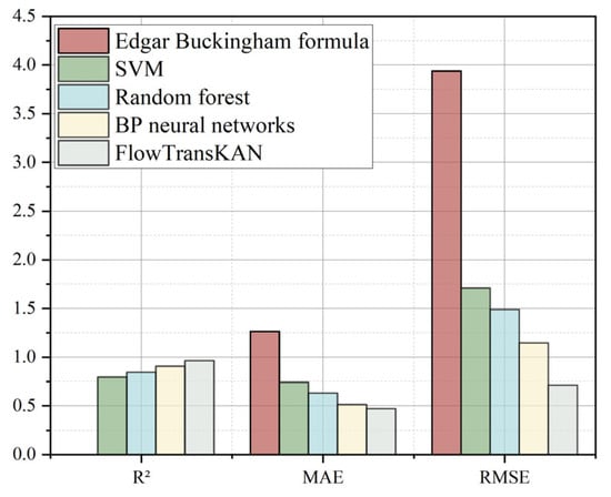 To quantify the discrepancies between the models, the results are presented in the form of a histogram, as shown in Figure 14. The results indicate that FlowTransKAN outperforms comparative models across all evaluation metrics. This performance enhancement stems from (1) the Transformer’s self-attention mechanism, which improves global data pattern recognition, and (2) the integrated KAN–Flow architecture, where spline-based activation replaces fixed activation functions, eliminating the need for excessive neurons to compensate for limited nonlinear representation capacity. This approach enhances approximation efficiency and reduces data acquisition costs while ensuring the model maintains high prediction accuracy even with limited samples. Although Edgar Buckingham’s formula, as a classical physical theorem, has broad applicability, it lacks the flexibility and adaptability required for complex, multi-factor coupled pipeline resistance loss problems. Similarly, support vector machines exhibit limitations in capturing intricate nonlinear relationships, potentially failing to adequately model the complex patterns inherent in pipeline resistance loss. Random forest is occasionally prone to overfitting, particularly when trained on large-scale pipeline datasets. This overfitting tendency may compromise the model’s generalization performance when applied to unseen data. While the BP neural network demonstrates strong capability in modeling complex nonlinear relationships, its performance in fitting pipeline pressure data requires further improvement. In contrast, the proposed FlowTransKAN model exhibits superior performance in capturing intricate data patterns and generating accurate predictions compared to conventional and classical approaches.
