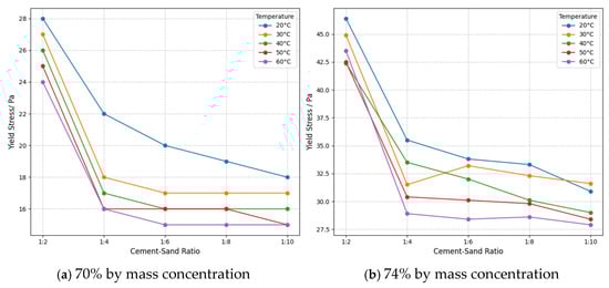 In sensitivity analysis, simulating temperature fluctuations is a crucial aspect of evaluating model robustness to environmental variables. Experiments systematically analyzed the response characteristics of model outputs to temperature variations under fixed parameter conditions using different temperature levels. Taking plastic viscosity as the observation metric, the temperature sensitivity differences between solid concentrations of 70% and 74% were compared. As shown in Figure 15, at 20 °C, the differences in plastic viscosity across various cement–sand ratios were minimal. However, as the temperature rose above 40 °C, the plastic viscosity of the 74% concentration samples decreased significantly more than that of the 70% group. Furthermore, the inhibitory effect of high temperature on plastic viscosity became more pronounced with higher cement–sand ratios. Sensitivity to material proportion parameters increases in high-temperature environments. Therefore, parameter combinations should be optimized for temperature gradients in practical applications to enhance model stability under varying temperature conditions.