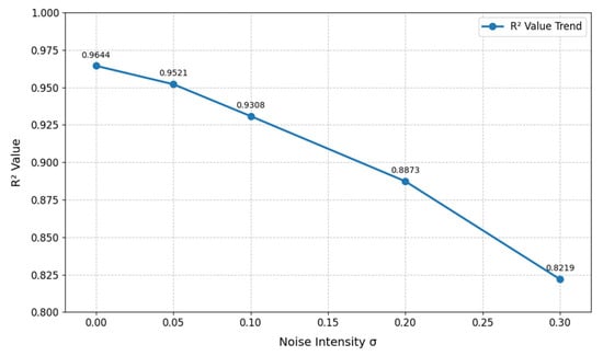 In the sensitivity analysis of sensor noise disturbances, Gaussian noise of varying intensities was added to the pressure data (to simulate measurement errors) to analyze the trend in the R2 value of the model output. As shown in Figure 16, when there is no noise, the R2 value is 0.9644, indicating good model fitting performance. As the noise intensity increases, the R2 value gradually decreases. When σ = 0.30, the R2 value drops to 0.8219, indicating that the higher the noise intensity, the more significant the decline in model fitting accuracy, and strong noise can severely impair model performance. From the perspective of data change magnitude, when the noise intensity increases from 0.00 to 0.05, the decrease in the R2 value is relatively small. However, when the noise intensity increases from 0.25 to 0.30, the decrease in the R2 value becomes more significant, indicating that the model is more sensitive to high-intensity noise. Once the noise intensity exceeds a certain threshold, the degradation of model accuracy accelerates. This phenomenon suggests that during actual data collection, it is essential to strictly control noise intensity at a low level (σ ≤ 0.10) to prevent model performance from deteriorating sharply due to noise accumulation.