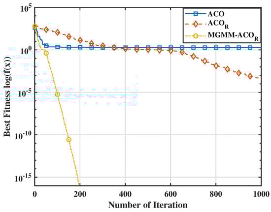 To further substantiate the effectiveness of the proposed MGMM- algorithm, we carried out a comparative study with particle swarm optimization (PSO) and its advanced variants. Notably, when evaluated against the most recent PSO variant, HT-PSO [], the MGMM- algorithm consistently demonstrated superior performance over a wide range of benchmark functions. The results indicate that the proposed method converges rapidly while perfectly avoiding local optima, underlining its effectiveness in solving complex optimization problems. The aforementioned interpretations are further supported by the variation in average optimum fitness values (on a logarithmic scale) illustrated in Figure 3, Figure 4, Figure 5 and Figure 6. These figures demonstrate the superior convergence behavior of the proposed MGMM- algorithm compared to other algorithms.