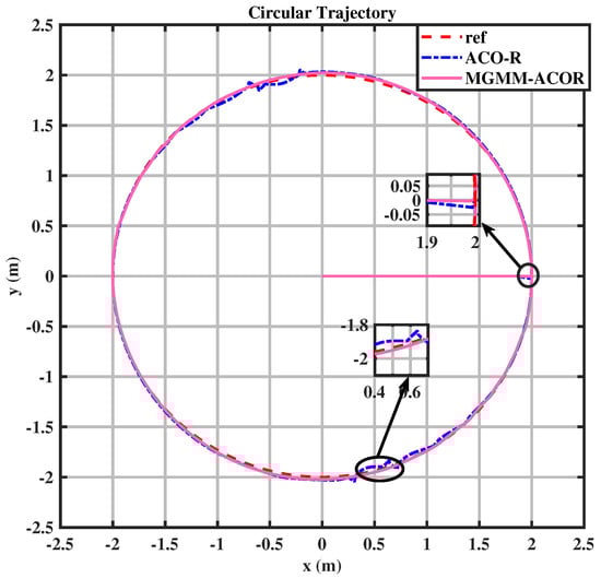 For the circular trajectory, illustrated in Figure 7, the MPC controller parameters were set as follows: a prediction horizon time of T = 0.15 s and a prediction step count of N = 10. The weighting matrices were optimized using both of the previously mentioned algorithms. The MGMM- algorithm demonstrated significantly superior tracking performance compared to . It was the first to converge to the trajectory and maintained stable and precise tracking throughout. The results are detailed in Figure 8 and Figure 9, where the performance and control actions during the circular path are illustrated.