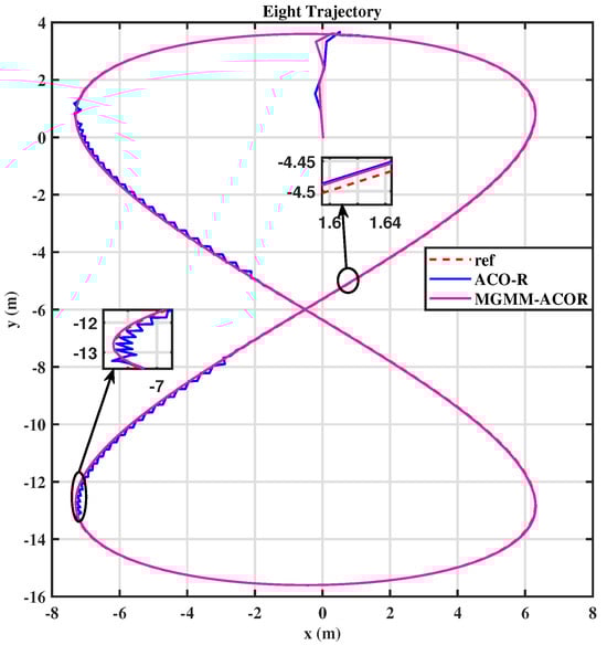 For the eight trajectory shown in Figure 10, the MPC controller parameters were set as follows: a prediction horizon time of T = 0.15 s and a prediction step count of N = 15. The MPC controller’s weighting matrices, optimized by the MGMM- algorithm, ensured superior accuracy and stability. Initially, the algorithm worked to align the robot with the reference trajectory and progressively improved tracking precision. It effectively handled the complex curvature of turning maneuvers, maintaining consistent trajectory adherence. The performance during this scenario is illustrated in Figure 11 and Figure 12.