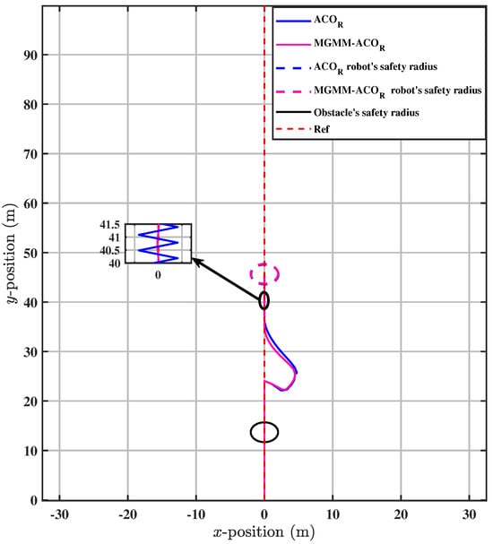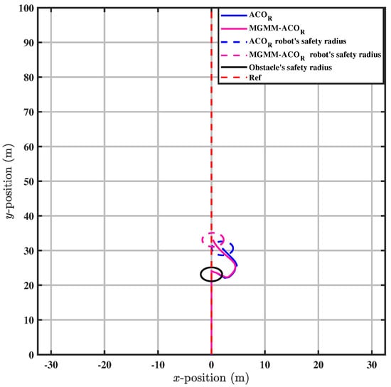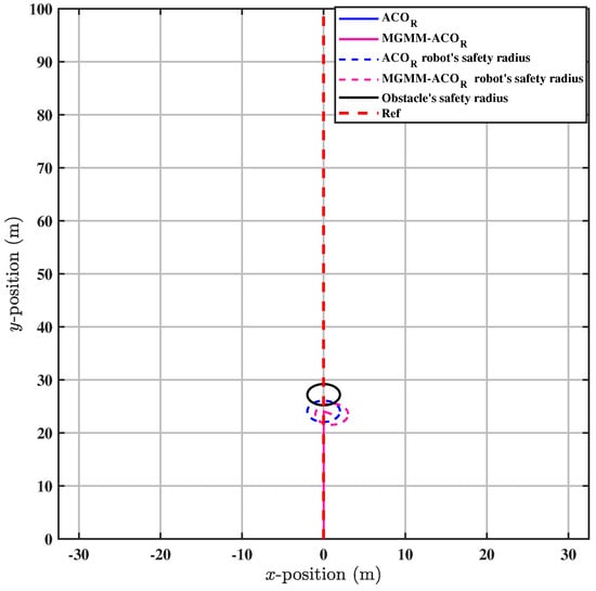 The results indicate that the weighting matrices of the MPC controller, optimized by MGMM-, enabled the robot to successfully avoid the obstacle first. On the other hand, the algorithm initially entered the safe zone, and then avoided the obstacle.