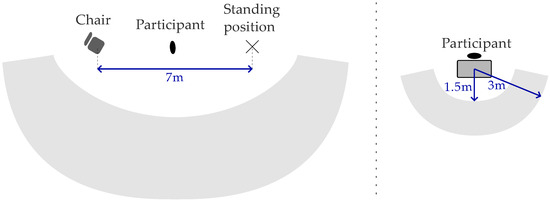 Each participant performs every activity for 1 min, except for “Mobility” activities. Here, the participant sits on a chair to start. When the experiment conductor gives the start signal, the participant stands up and walks to a marked spot on the ground (at a distance of 7 m from the chair, because the average walking speed of 4.5 km/h [29] translates to 5.6 s of walking time, roughly matching the durations of the sitting and standing activities). After standing for 5 s, we instruct the participant to walk back to the chair, sit down again, and stay seated for 5 s. We repeat this procedure for 3 min. The duration of 3 min provides approximately 1 min each of walking, sitting and standing. In total, the recording length for each participant is 10 min. Furthermore, we set the number of participants to ten, which results in a total of 100 min of recordings.
