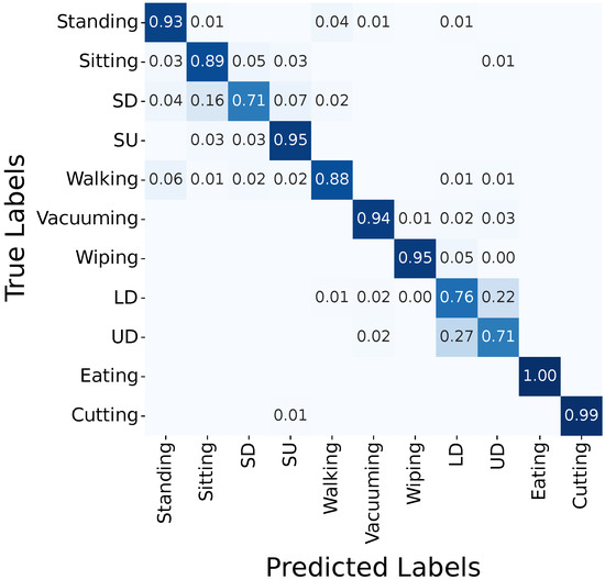 Confusion matrix for FlexTail-based HAR (RDST, ). Abbreviations: sitting down (SD), standing up (SU), loading dishwasher (LD), and unloading dishwasher (UD).