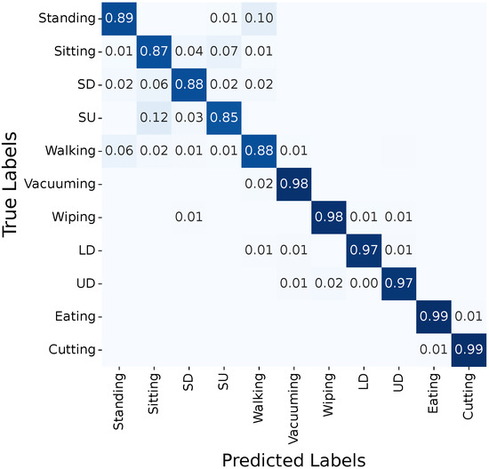 Confusion matrix for video-based HAR (QUANT, ). Abbreviations: sitting down (SD), standing up (SU), loading dishwasher (LD), unloading dishwasher (UD).