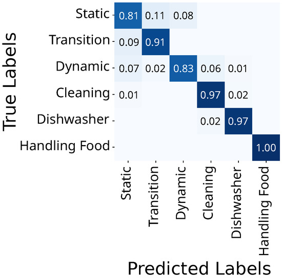 The video-based HAR classifies static and dynamic activities with only 81% and 83% correctness, respectively, while all others are above 90% (Figure 7). It best classifies cleaning, dishwashing and handling food with 97%, 97%, and 100% accuracy, respectively.