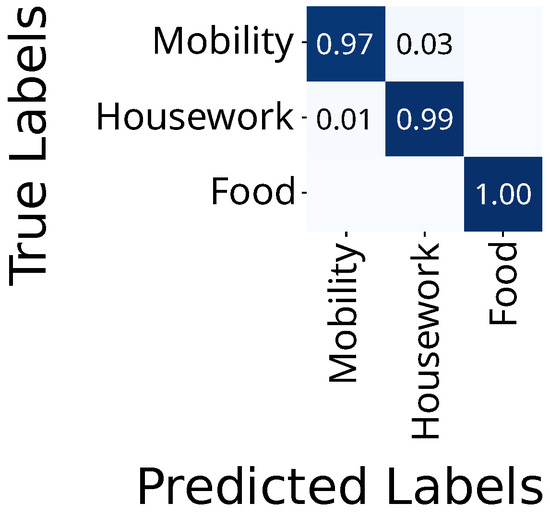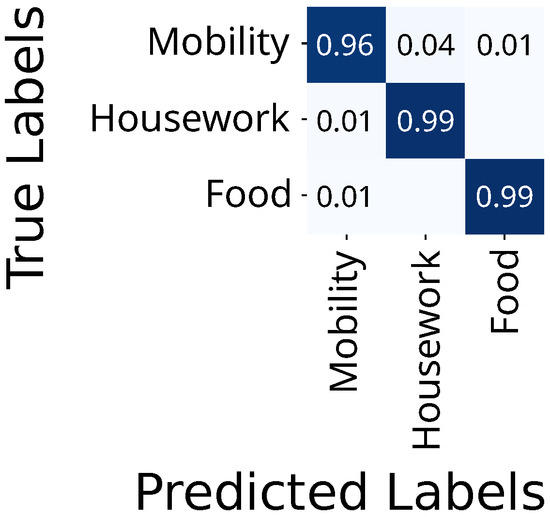 The FlexTail data yields accuracies of 99%, 99%, and 96% for mobility, housework, and food, respectively (Figure 8). There is no confusion between food and housework.