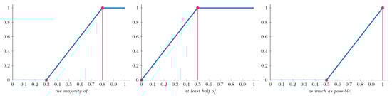 Fuzzy linguistic quantifiers used in the experiments. Each plot represents a fuzzy membership function over the [0, 1] interval, associated with a linguistic quantifier. These functions model the degree to which a given proportion satisfies the meaning of the corresponding quantifier. Pink dots represent the construction parameters for each quantifier.