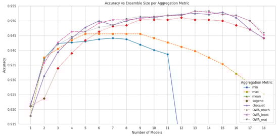 The impact of model aggregation on classification performance is illustrated in Figure 4, which shows the variation in test accuracy as a function of the number of quantized models used in each aggregation strategy. Each curve corresponds to a different aggregation function, highlighting how performance evolves as models are incrementally added or removed from the ensemble. Based on this analysis, Table 5 presents the final performance metrics—accuracy, precision, recall, and score—for each aggregation method using the optimal number of models. Notably, most aggregation strategies outperformed all individual models, with OWA operators achieving the strongest performance, indicating that combining predictions from multiple quantized classifiers effectively enhances classification robustness. The only exception to this trend was the YOLOv11x-cls model, whose performance exceeded the weakest-performing aggregation methods, namely the and operators.