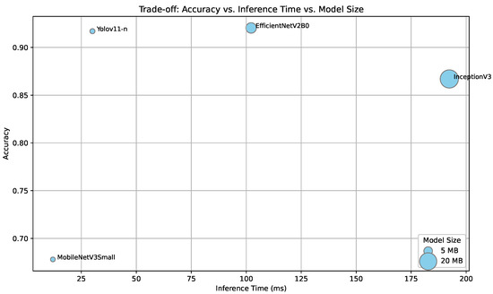 Figure 5 presents the trade-off between classification accuracy, inference time, and model size for a representative set of quantized models evaluated on a Raspberry Pi. EfficientNetV2B0 achieved the highest accuracy (92.04%) with an inference time just over 100 ms, making it a strong candidate for near real-time applications where latency constraints are moderate. In contrast, the quantized YOLOv11-n model reached a slightly lower accuracy (91.7%) but offered significantly faster inference (30.05 ms) and a more compact storage size, making it the most suitable option for real-time deployment in highly resource-constrained environments. This confirms the practical viability of our proposed solution and offers two strong deployment paths depending on application requirements.