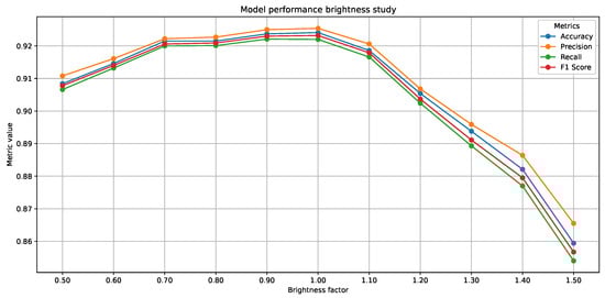 The results of the robustness tests under varying lightning conditions (see Figure 6) show that the model’s performance remains relatively stable across a broad brightness spectrum, with behavior that reflects its ability to adapt to different lighting conditions. According to the data obtained, key metrics such as Precision, Recall, and F1-Score range from 0.91 to 0.92 over a brightness range of 0.7 to 1.0, indicating remarkable consistency in normal to slightly dark lighting conditions. However, the model proves to be more robust against dark than over-illumination conditions; for example, at a brightness factor of 0.6, the metrics barely drop below 0.90, whereas at a factor of 1.4, the F1-Score drops to approximately 0.86 and the recall to 0.87, reflecting a greater sensitivity to overexposure. While these findings confirm the model’s robustness under most realistic lighting conditions, deployments in environments with strong lighting or glare may benefit from preprocessing techniques such as dynamic exposure adjustment or hardware-level lighting control. Further real-world testing under diverse environmental conditions is planned for future work.
