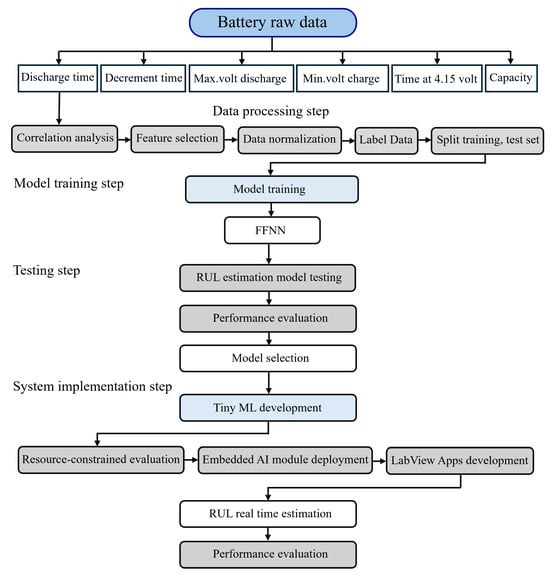 In the system implementation phase, the FFNN model is optimized using TinyML techniques for deployment on resource-constrained embedded hardware. The optimized model is integrated with an embedded AI sensor and connected to a LabVIEW-based application for real-time RUL estimation and system performance monitoring. This systematic methodology emphasizes effective model development and practical deployment for accurate RUL estimation in battery monitoring applications. The following subsections describe the methodology in four key stages: data acquisition, data preprocessing, model training and optimization, and model performance evaluation.