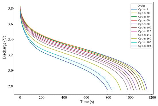 Charge–discharge cycles were conducted iteratively until the measured capacity, denoted as C, diminished to less than of the initial nominal capacity, represented as . A capacity is determined by integrating the current over the discharge duration: