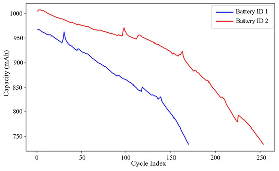 The capacity degradation trends for all batteries under standard discharge conditions are illustrated in Figure 3, which plots capacity against cycle numbers. The relationship between the cycle index and battery capacity (mAh) for two batteries, Battery ID 1 and 2, is depicted in Figure 4.