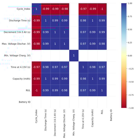 Features that are derived from raw voltage, capacity, and time data over numerous charge–discharge cycles are valuable for predicting the remaining useful life (RUL) of the batteries, serving as key indicators of battery performance, and offering valuable insights into battery behavior, as indicated by the dataset. Table 2 provides a detailed view of the central tendencies (mean, median), variability (standard deviation), and ranges (min, max) for each feature, giving insight into the behavior of the batteries across multiple cycles. The correlation analysis presented in Figure 5 provided a heatmap of associations between RUL (remaining useful life) and other battery-related features. The heatmap reveals that RUL is most strongly and positively correlated with features that reflect the battery’s operational performance, such as discharge time, voltage decrement times, and capacity.