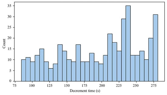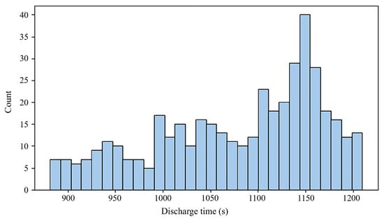The existence of strong correlations with these performance metrics implies that these characteristics are essential for estimating the battery’s remaining lifespan. A visual representation of the relationship between the RUL and three selected features is provided by the histograms in Figure 6, Figure 7 and Figure 8. These visual distributions serve as an initial exploratory analysis of the data, establishing a basis for subsequent statistical analyses that will quantify the precise relationships between each feature and the RUL. They can be used as inputs to predict RUL, as variations in capacity, voltage decrement time, and discharge time are directly correlated with the health of a battery or RUL.