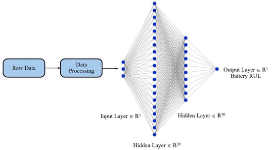 To accurately estimate the remaining useful life (RUL) of lithium-ion batteries, we employed a feedforward neural network (FFNN) architecture designed to leverage three critical battery performance parameters—discharge time (s), decrement time within the 3.6–3.4 V interval (s), and capacity (mAh)—which are selected for their well-established correlation with cycle aging in lithium-polymer cells. As shown in Figure 9, the FFNN consists of an input layer with three neurons, two hidden layers that capture the nonlinear relationships among these features, and an output layer that yields the scalar RUL prediction. This model was specifically chosen to align with the practical constraints of the application, namely implementation on a resource limited embedded platform, i.e., the Raspberry Pi RP2040 microcontroller, built around a dual-core Arm Cortex-M0+. The FFNN’s architecture is inherently well suited for TinyML applications due to its low computational and memory footprint relative to more complex recurrent networks. This lightweight nature enables real-time inference to be performed directly on the embedded hardware, without reliance on cloud-based resources or specialized hardware accelerators. Moreover, the simplicity of the FFNN structure facilitates straightforward deployment and optimization, which is essential for ensuring low-cost, low-power, and low-latency operation in industrial battery management system applications [22].