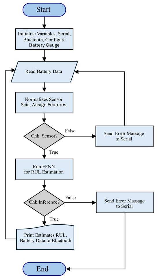 The flowchart in Figure 12 illustrates the process of a C/C++ implementation on a Raspberry Pi Pico RP2040 W, which initializes and manages a battery monitoring system using a Babysitter BQ27441 battery gauge integrated with Edge Impulse’s TinyML framework to estimate the battery’s remaining useful life (RUL) using three features. The system starts by initializing variables, serial communication, Bluetooth, and the battery gauge configuration. It then reads battery data and normalizes the sensor data to assign relevant features for the RUL estimation model. If the sensor data pass a validation check, the FFNN model runs the RUL estimation process. The model inference is further checked for successful execution, and if all conditions are met, the estimated RUL and battery data are transmitted via Bluetooth to the LabView application on the laptop. Any failure in sensor validation or inference triggers an error message to be sent through the serial interface.