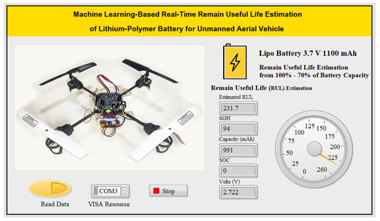In this study, the remaining useful life (RUL) of the UAV’s LiPo battery is estimated during in-flight operation, following a full charge and UAV takeoff. The embedded AI module continuously acquires real-time data on battery capacity, discharge time, and voltage decay time throughout the flight mission. Notably, RUL estimation is conducted in real time rather than post-operation, enabling immediate insight into battery health. It is important to emphasize that the predicted RUL values are considered valid only within the operating voltage range of 2.70 V to 2.799 V, which has been empirically validated and is traceable within the LabVIEW-based monitoring environment. This constraint ensures both the accuracy and operational reliability of the RUL predictions under embedded deployment conditions.