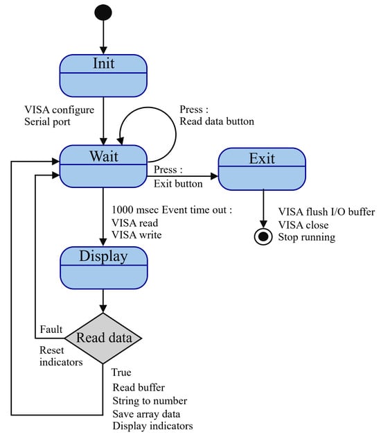 The application architecture is designed as a state machine [27,28]. As depicted in Figure 14, the process begins in the “Init” state, during which the system configures the serial port for communication via the VISA protocol. The program subsequently enters the “Wait” state, during which it monitors for input from users. Upon activating the “Read Data” button, the application transitions to the “Read Data” state, where it acquires battery metrics from the hardware through Bluetooth communication, processes the data (e.g., converting it from strings to numerical values), and verifies for any faults, resetting indicators as required. The data are subsequently transmitted to the “Display” state, where real-time battery metrics, including RUL and SOH, are refreshed on the GUI. The “Exit” state manages the application’s termination upon the user’s activation of the exit button. It ensures appropriate cleanup by flushing the I/O buffer, closing the VISA connection, and stopping the program. The modular state machine architecture facilitates explicit event management and logical advancement, guaranteeing the system effectively handles duties such as serial connection, data processing, and real-time display. This design is scalable and robust, rendering it ideal for battery monitoring and remaining useful life estimation in UAVs.