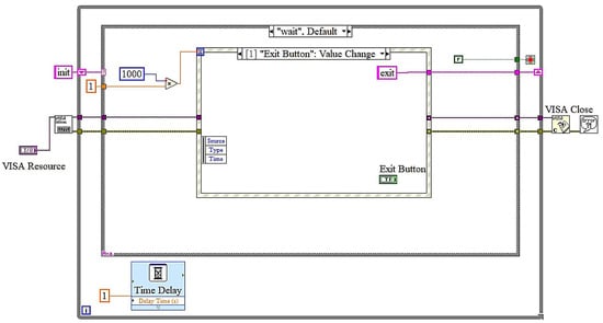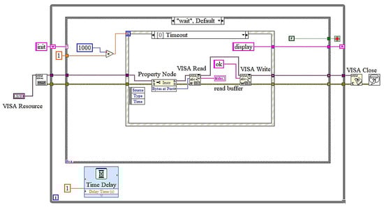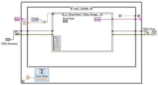 The LabVIEW block diagrams depict a state machine-based implementation for a real-time battery monitoring application, emphasizing remaining useful life (RUL) estimation. In the initialization state, the VISA protocol is configured to facilitate serial Bluetooth communication with the hardware. This state ensures the initialization of all requisite parameters, including baud rate and port configurations, so preparing the system for seamless operation. The wait state manages event-driven functions. The timeout event in Figure 15 ensures periodic data verifications, during which the system executes operations, including reading from and writing to the serial buffer every 1000 milliseconds. The read data event in Figure 16 is triggered when the user presses the “Read Data” button.