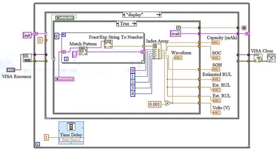 During this event, data are extracted from the serial buffer, transformed into a usable format, and prepared for display or additional analysis. The exit event in Figure 17 is activated when the user presses the “Exit” button, initiating a systematic termination procedure. This involves flushing the I/O buffer, closing the VISA connection, and configuring the system for shutdown, ensuring no residual tasks persist. In the display state in Figure 18, the processed data, including battery capacity, state of health (SOH), and remaining useful life (RUL), are refreshed on the graphical user interface, offering real-time feedback to the user. Ultimately, the exit state ensures systematic termination of the application by executing cleanup operations, including shutting all processes and closing resources. The LabVIEW application, integrating an embedded AI sensor, offers a reliable and effective solution for real-time remaining useful life assessment of lithium-polymer batteries. The system guarantees modularity and reliability by employing a state machine architecture with clearly specified states. The user-friendly interface facilitates effortless interaction, while real-time data visualization provides precise monitoring of essential battery parameters.