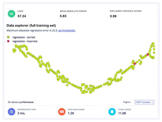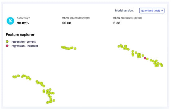 Edge Impulse is utilized to establish a pipeline for forecasting the remaining useful life (RUL) of a 3.7 V Li-Po battery. The model takes raw data as input and produces a scalar value ranging from 0 to 253, indicating the remaining useful life cycles. The training is set to 1000 cycles, with a learning rate of 0.005, and utilizes the CPU for processing. Furthermore, of the dataset is designated for validation to evaluate model performance, and a batch size of 32 is established to optimize computational efficiency and memory utilization. The model is additionally refined for edge deployment via int8 quantization, minimizing its memory and processing requirements. The neural network architecture seen in Figure 9 is constructed via the Keras Sequential API, enabling the sequential stacking of layers. The architecture starts with two fully connected dense levels. The first dense layer comprises 20 neurons and utilizes the ReLU activation function, enabling the model to account for nonlinearity and enhance gradient flow during backpropagation. The subsequent dense layer comprises 10 neurons, employing ReLU activation. These layers facilitate the network’s acquisition of intricate patterns in the data by adding learned weights to the input and propagating it through the network. The final output layer is configured to provide a singular class, rendering this architecture appropriate for forecasting the remaining useful life (RUL) of a battery.