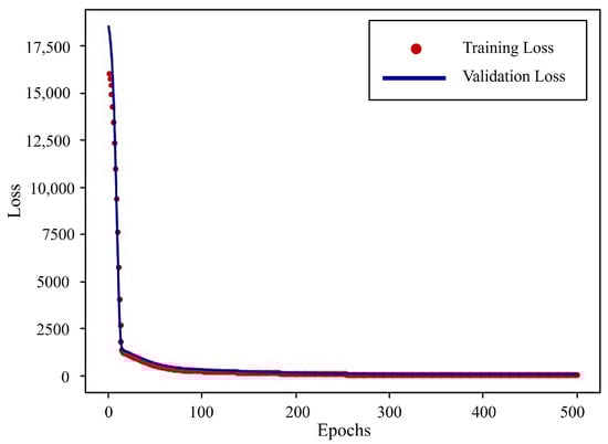 where N represents the number of training input–output pairings, where denotes the real output and signifies the model output. Equation (8) represents the loss function , which measures the discrepancy between the model’s predictions and the true values within the dataset. Specifically, it calculates the expected mean squared error (MSE) across all input–output pairs sampled from the empirical data distribution . The term denotes the difference between the predicted output for the k-th sample and its corresponding actual RUL , with the squared Euclidean norm quantifying the magnitude of this error. The factor simplifies the computation of gradients during optimization. Finally, the constant term does not influence the gradient-based updates but may arise from certain normalization or regularization processes. Overall, this formulation ensures that the training procedure minimizes the average prediction error, thereby aligning the model’s parameters to improve accuracy.