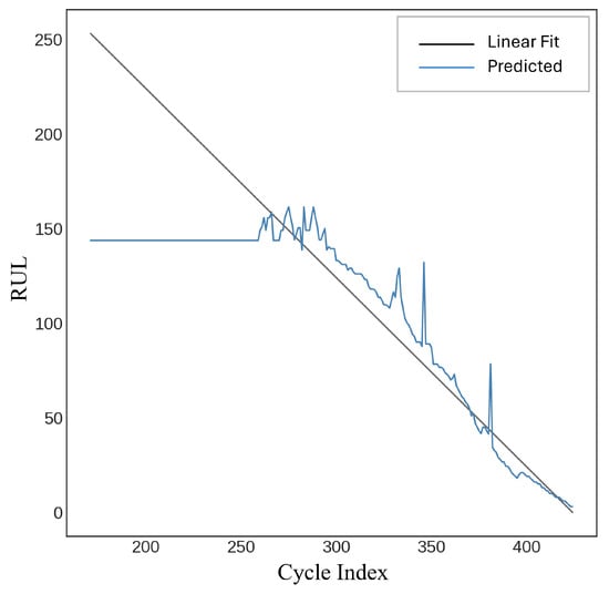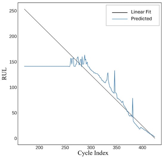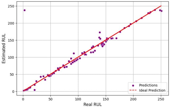 The objective remaining useful life (RUL) variable was forecasted using the Random Forest Regressor [30]. The model is initialized using many hyperparameters: n _estimators = 100 (indicating 100 decision trees), max _features =’sqrt’, and more configurations, including bootstrap = True, to utilize bootstrapped datasets. The model is trained using Xtrain and Ytrain, and the training duration is documented. Using the test data (Xtest), predictions are generated, and evaluation metrics such as R-squared, root mean squared error (RMSE), and mean absolute error (MAE) are calculated. Figure 26 presents an R-squared score of , an RMSE of 44.22, and an MAE of 30.08.