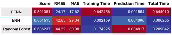 Figure 27 presents a comparison matrix assessing three models, FFNN, KNN, and Random Forest, according to their scores (R-squared), RMSE, MAE, and computational times. FFNN has superior performance with an R-squared of 0.8913, the minimal RMSE of 24.17, and the lowest MAE of 17.62, establishing it as the most precise model. Nonetheless, its training duration is considerably greater at 9.64 seconds, rendering it less computationally efficient. KNN exhibits middling performance, attaining an R-squared value of 0.6616, although it is the most rapid in both training and prediction, with an overall runtime of merely 0.0063 seconds. Random Forest exhibits a little reduced R-squared value (0.6362) relative to KNN, alongside the greatest RMSE (44.22) and MAE (30.08) with an overall runtime of 0.209 seconds. In summary, FFNN excels in accuracy, whereas KNN is superior in speed.