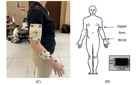 Measurements taken with the CuffLink system, and IMUs were corroborated using the Vicon optical motion capture system, which operates at 120 Hz with 14 T40S cameras (Oxford, UK). For both groups, 27 Vicon markers were used to track key anatomical and device movement (Figure 1A–C) [29,30,31]. Wearable sensors from BioMech Health were placed above the elbow and near the wrist of the participant to track shoulder movement (Figure 1D and Figure 2). Sensor and IMU placement were selected to align closely with bony anatomical landmarks and were applied by a trained clinical specialist to help minimize soft tissue artifacts (STAs).