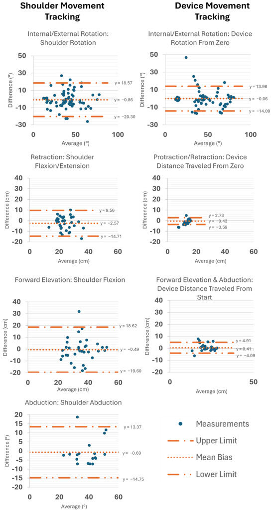 For device rotation during IR/ER, the mean bias was 1.98°, with limits of agreement from −13.13 to 9.17°. For device motion during protraction/retraction, the mean bias was 1.49 cm, with limits of agreement ranging from −2.23 to 5.20 cm. Finally, device motion during combined forward elevation and abduction showed a mean bias of 1.60 cm, and the limits of agreement were −0.74 to 3.93 cm. Across all movement types, most measurements fell within the limits of agreement, although some outliers were observed, particularly at higher average values.