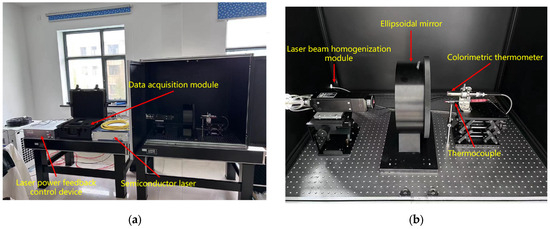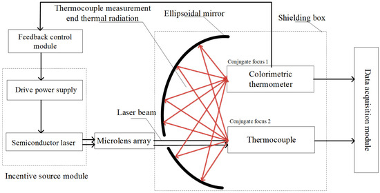 The thermocouple time constant testing system used in this thesis mainly consists of a semiconductor laser module (Wuhan Ruike Laser Technology Co., LTD., Wuhan, China), a laser power feedback control module (Self-made), a data acquisition module (Shanghai Jianyi Technology Co., LTD., Shanghai, China), an ellipsoidal mirror module (Self-made), a colorimetric temperature measurement module (Changzhou Sijie Optoelectronic Technology Co., LTD., Changzhou, China), etc. A schematic diagram of the testing system is shown in Figure 2, and a physical diagram of the testing system is shown in Figure 3.