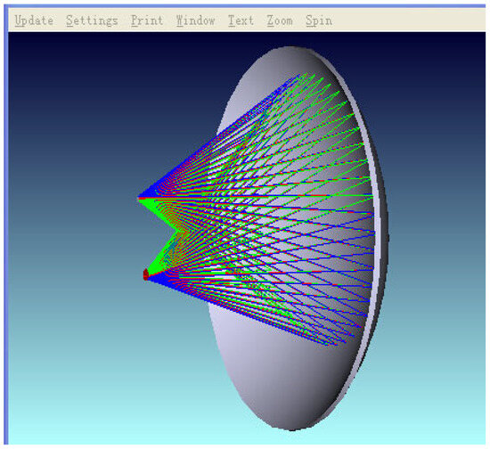 In this testing system, the most important component is the ellipsoidal mirror module. When heating a thermocouple using the laser method, the thermocouple junction exhibits a unique heat dissipation behavior during the laser energy injection process: its microscale structure significantly limits the heat capacity. When the surface temperature rise in the thermocouple is in a relatively low range, the heat exchange between the junction and the surrounding environment presents a quasi-point source radiation mode, and the thermal energy is uniformly dispersed into three-dimensional space in an approximately spherical wave form. If a colorimetric thermometer is used to directly measure the surface temperature of the thermocouple under test, it is prone to interference from other surrounding heat sources, resulting in inaccurate output. Therefore, it is necessary to converge the thermal radiation on the surface of the thermocouple under test. The ellipsoidal focusing mirror is an inwardly concave mirror, which has relatively ideal conjugate imaging properties and can provide valuable optical characteristics: that is, when an object is at any one of the focal points, after reflection, it can be imaged without aberration at the other focal point. In order to give full play to its conjugate imaging characteristics, it is obtained through theoretical calculation that when the radius of the major axis is 177 mm, the radius of the major axis is 170 mm, and the distance between the conjugate foci is 49.28 mm, the sphericity of the ellipsoidal mirror is not less than 3sr, and the PV value of the ellipsoidal focusing mirror is 8 μm. This is simulated by using ZEMAX software2009. A simulation shadow diagram is shown in Figure 4. It is found that at this time, there is a better reflection and convergence effect, which can meet the test requirements of the system designed in this thesis.