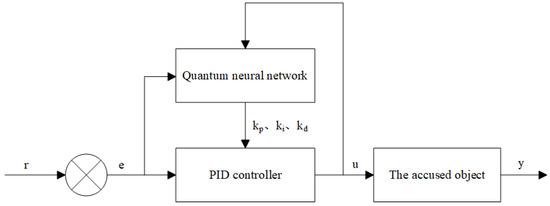The structure of the PID control system based on the quantum neural network is shown in Figure 6. The controller consists of two parts: One is the conventional PID controller, which is used to directly perform closed-loop control on the object, and the three parameters are tuned online. The second is the quantum neural network. According to the operating state of the system, through the information calculation method of the neurons in the quantum neural network and the adjustment of the weight coefficient matrix based on the gradient descent method, the output variables of the quantum neural network correspond to the parameters of the PID controller under the optimal control rate, and thus the PID parameters are adjusted to achieve the optimization of certain performance indicators.