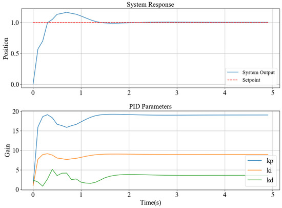It can be seen from the PID parameter variation curve that in the early stage of network training, kp, ki, and kd are significantly adjusted within the given range to find the parameters that make the system output reach the set value. After 1 s, the variation trend in PID parameters decreases, and the output curve of the system also tends to be stable. Finally, the parameters of the PID controller are kp = 19.06, ki = 8.85, and kd = 3.65.