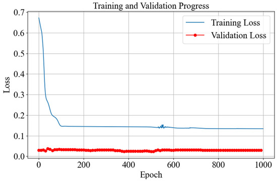 In this simulation experiment, the input of the training set is the error signal of the system under the zero initial condition (including systematic error, integral of error, and differential of error), and the input of the verification set is the systematic error signal under the non-zero initial condition. It can be seen from Figure 9 that near the 100th training, the loss function of the network reaches the minimum value, indicating that the convergence speed of the network is very fast and the PID parameter values that stabilize the system can be found quickly. The final value of the loss function of the training set in the figure is 0.1341, meeting the convergence requirements. It can be seen from the variation curve of the loss function of the validation set that there are some fluctuations in the loss function at the beginning of training, but it also met the convergence requirements. Finally, the value of the loss function of the validation set is 0.0298, which indicates that this network has good robustness and still has a good generalization ability for the unseen initial conditions and can eliminate the state disturbances of the controller well.