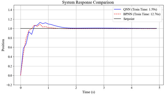 It can be seen from the output curves of the simulation system in Figure 10 that under the control of two different network PID controllers, the time for the simulation system to reach the peak is basically the same, both being about 0.7 s, indicating that both controllers have a fast response speed and excellent dynamic performance. Moreover, the systems eventually reached the steady state, and the steady-state errors were all within 2%, indicating that both controllers have excellent stability and robustness, and the tracking accuracy is very high. However, the training durations of the two networks are significantly different. The training time of the quantum neural network is 1.59 s, while that of the BP neural network is 12.76 s. This indicates that the designed quantum neural network is significantly more efficient than the BP neural network and has certain superiority in computational efficiency.