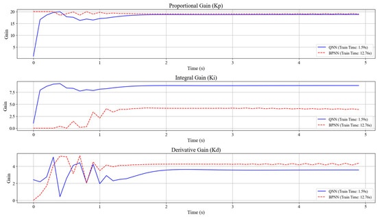 It can be concluded from the PID parameter variation curve in Figure 11 that both networks can quickly obtain stable final values of PID parameters. Although the obtained final values of parameters are different, this is reasonable. Because for a dynamic system, the combination of PID parameters that enables it to achieve good performance is often more than one, the neural network only obtains the optimal combination of PID parameters at this time when the loss function is minimized.
