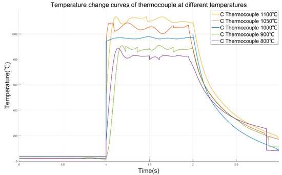 The C-type thermocouple used in the test in this paper is the E6-20 Series C-type thermocouple produced by Nanmac Company (397 Williams St, Marlborough, MA, The United States of America). Its diameter is 0.508 mm, and it has a three-layer insulation structure. When applying the system constructed in this thesis to test the time constant of thermocouples, a laser is output at 1 s. The sampling frequency of the thermocouple is set to 2000 Hz. The temperature values measured by the colorimetric thermometer and the thermocouple are taken as the inputs of the quantum neural network to obtain the optimal parameters of the PID controller. The obtained kp, ki, and kd are applied to the PID feedback control circuit. The laser output power was changed in real time to make the C-type thermocouple reach temperature equilibrium at 800 °C, 900 °C, 1000 °C, 1050 °C, and 1100 °C, and the temperature variation curve of the thermocouple was obtained, as shown in Figure 12.