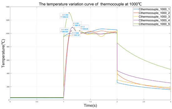 To explore the repeatability of the thermocouple time constant testing system, five data points of the C-type thermocouple reaching temperature equilibrium at 1000 °C are obtained through experiments. Similarly to the previous experiments, the laser begins to produce output at 1 s, and the sampling rate of the thermocouple is 2000 Hz. The thermocouple temperature variation curve as shown in Figure 13 is obtained.