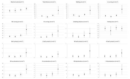 - High-intensity accelerations (HI accelerations, m·min−1): Distance covered while accelerating beyond 3 m·s−2.