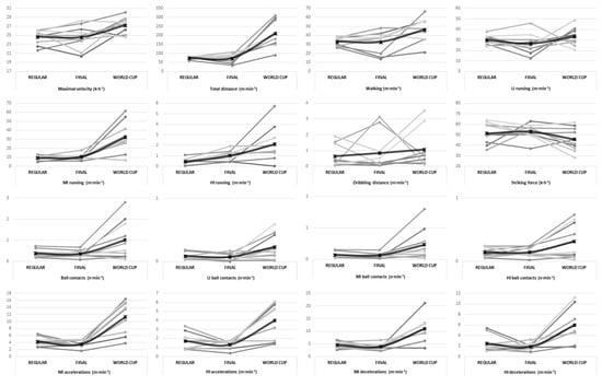 Individual (in grey lines) and average (in black line) player responses for physical and technical requirements across competitive contexts for Sample 2.