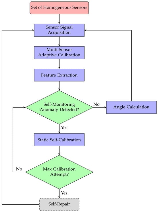 Should self-calibration fail to restore normal operation, the system advances to a self-repair phase. In our architecture, self-repair is conceived as a hierarchical strategy: from hardware redundancy (e.g., switching to spare sensor modules), through dynamic software reconfiguration, up to algorithmic adaptation via online parameter updates. In the present work, we explicitly demonstrate and benchmark the self-repair capability at the algorithmic level under static fault conditions, where self-repair is manifested as the system’s ability to restore or maintain measurement accuracy by adapting algorithm parameters in response to faults. Thus, our contribution extends beyond a purely conceptual framework, providing quantitative results for static scenarios.