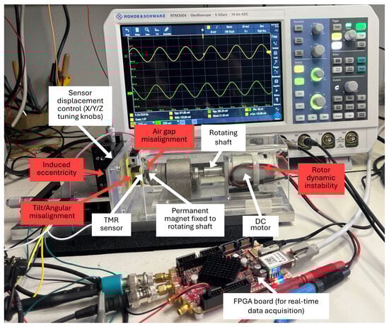 The experimental setup shown in Figure 2 [33] is specifically designed to allow controlled and repeatable fault injection in TMR sensor systems. At the core of the setup is TFF953 TMR sensor (Sensitec GmbH, Mainz, Germany), powered by a 3.3 V DC supply. This sensor contains two orthogonally oriented, fully differential Wheatstone bridges, which generate analog sine and cosine outputs offset by 90° in phase and with a common-mode voltage of 1.65 V. The analog signals are digitized in real time using STEMlab 125-14 (Red Pitaya, Solkan, Slovenia) with 14-bit ADCs sampling at 15 kHz. This acquisition rate ensures accurate capture of the sensor outputs at a shaft rotation speed of 1200 rpm. More than one million samples are collected per experimental run, allowing for detailed signal analysis. Real-time monitoring and signal integrity checks are performed using RTM3004 MSO (Rohde & Schwarz GmbH & Co. KG, Munich, Germany).