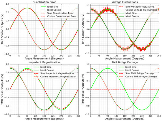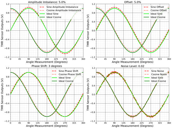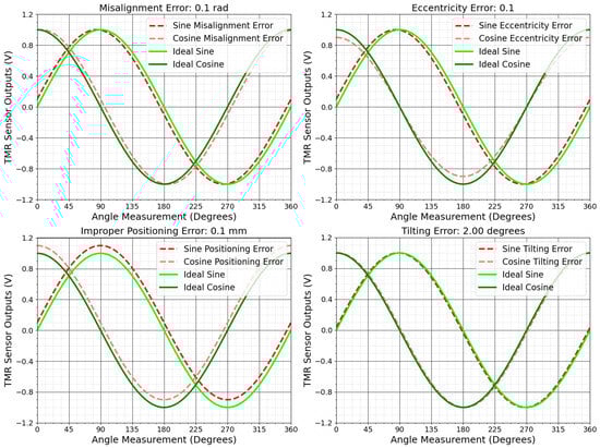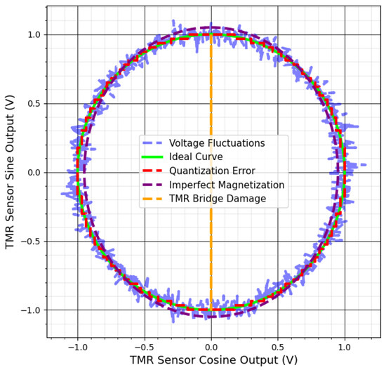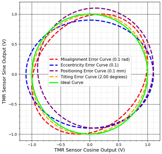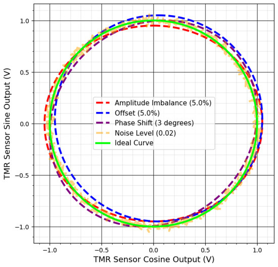 Figure 5 shows the effects of these measurement errors on the TMR sensor’s output. Figure 6 illustrates deviations from the ideal circular shape, centered at (0, 0), for each error type.